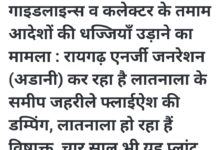 रायगढ़ – जिला मुख्यालय से महज 6-7 किलोमीटर की दूरी पर स्थित किरोड़ीमल नगर इन दिनों स्थानीय प्रिंट व डिजिटल मीडिया पर लगातार सुर्खियों में बना हुआ है जिसकी वजह है कि यहाँ के ग्राम कोकड़ीतराई में स्थित सरकारी डेम। जिसके एक बड़े भूभाग पर न सिर्फ अवैध तरीके से औद्योगिक अवशिष्ट विषाक्त फ्लाईऐश को डालकर पाटा जा रहा है बल्कि स्थानीय भू माफियाओं द्वारा स्टाम्प पेपर पर फर्ज़ी लिखी-पढ़ी कर इसे बेचा भी जा रहा है।