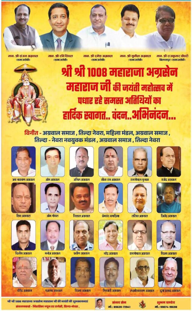 आज शाम तिल्दा , रायपुर के श्री अग्रसेन जयंती समारोह में बतौर मुख्य अतिथि शिरकत करेंगे NR ग्रुप के युवा उद्यमी संजय अग्रवाल..