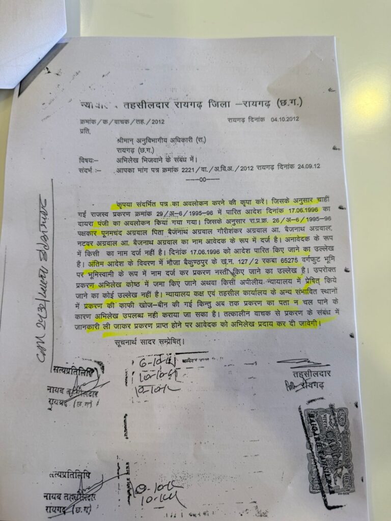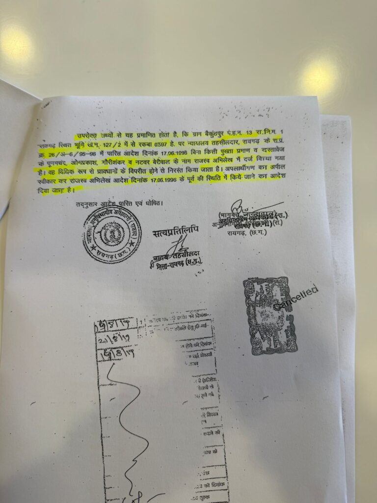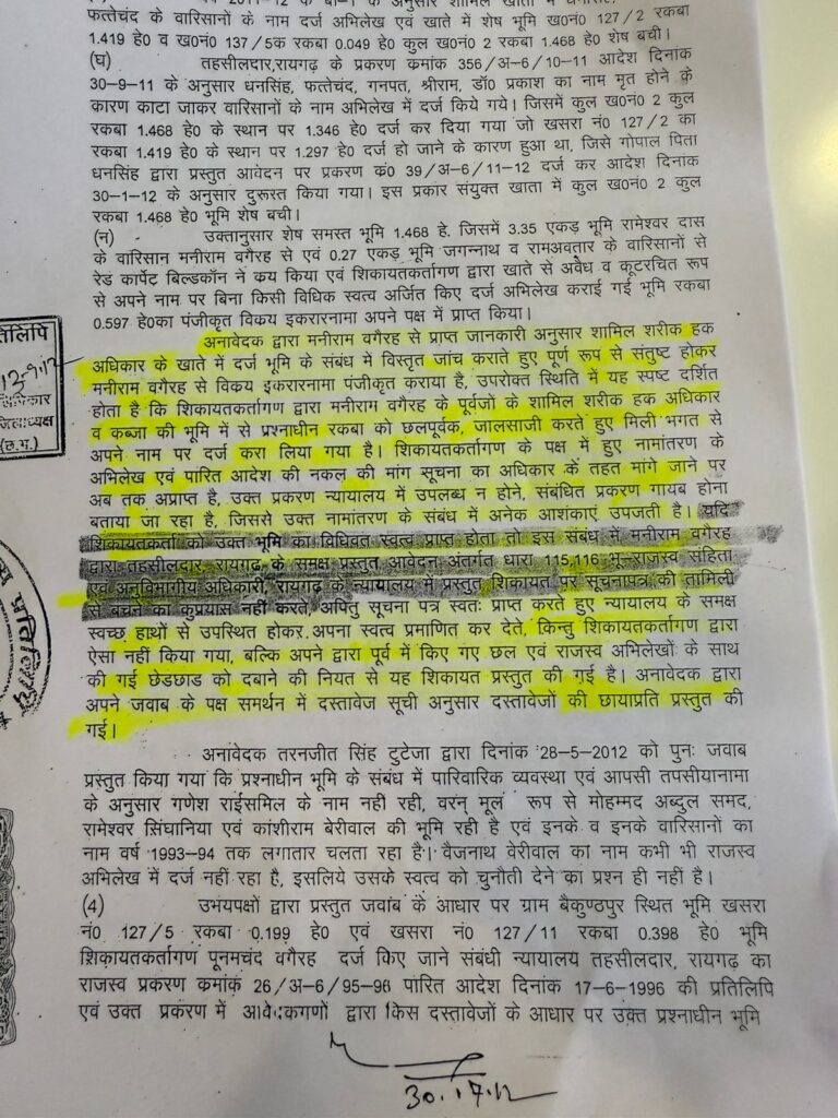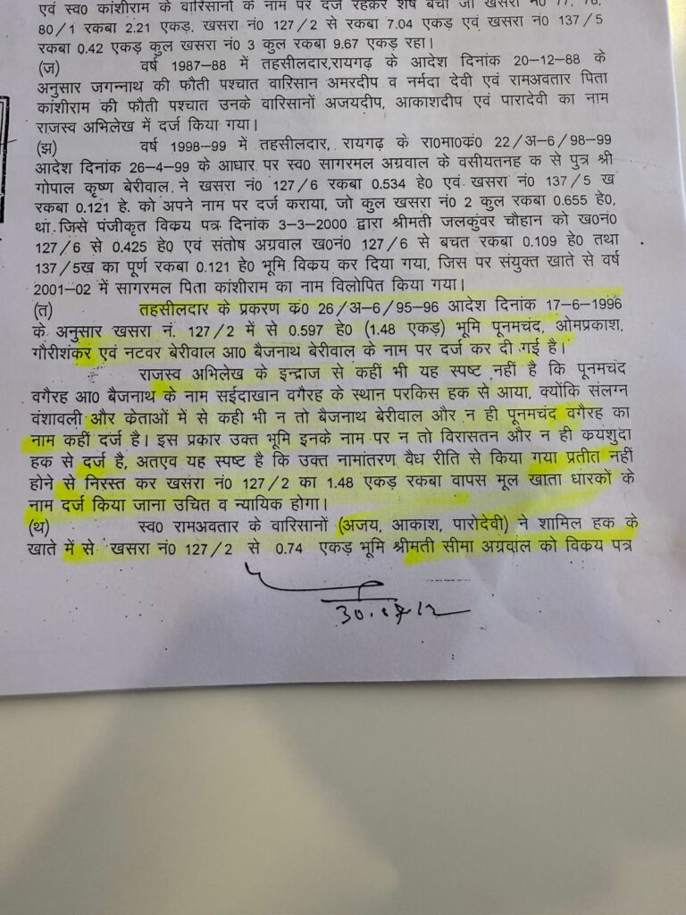 रायगढ़। जिला मुख्यालय रायगढ़ में 60 करोड़ के जमीन घोटाले का एक सनसनीखेज मामला सामने आया है। पूरा मामला शहर के कोतरा रोड चूना भट्टा का है। जहां नटवर बेरीवाल एंड परिवार ने फर्जी नामांतरण के जरिये सिंघानिया परिवार के नाम से दर्ज जमीन को अपने नाम कर लिया था। जबकि इस मामले में नजूल अधिकारी से लेकर एसडीएम और तहसीलदार न्यायालय ने प्रकरण की सुनवाई पूरी करते हुए स्पष्ट कर दिया है कि बेरीवाल परिवार द्वारा कराया गया नामांतरण पूरी तरह से फर्जी है। तत्कालीन एसडीएम न्यायालय भी बकायदा उक्त जमीन से बेरीवाल परिवार का नाम काटकर सिंघानिया परिवार का नाम पूर्व की भांति 1995-96 की स्थिति में दर्ज करने के आदेश पारित कर चुका है। क्योंकि जमीन के फर्जीवाड़े में शामिल बेरीवाल परिवार अब तक इस मामले में कोई भी दस्तावेज सक्षम न्यायालय में पेश नहीं कर पाये हैं। यह पूरा मामला लगभग 20 साल पुराना बताया जा रहा है।