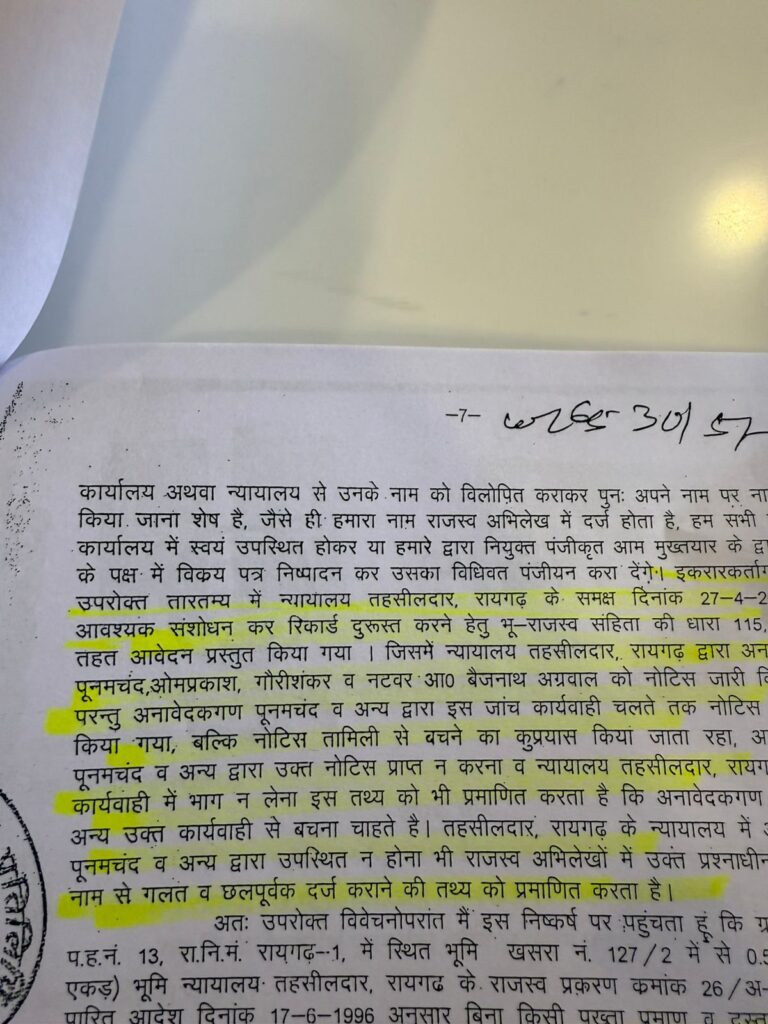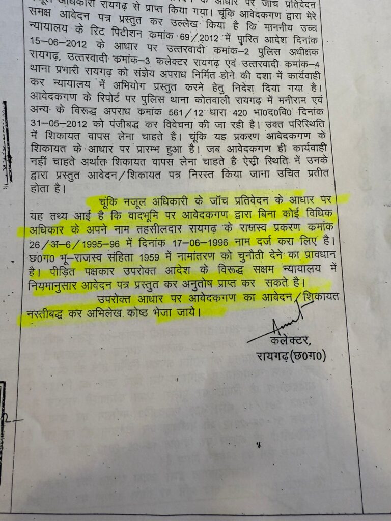 इस खबर को प्रसारित करने के पीछे हमारा एकमात्र उद्देश्य सिर्फ भूमि स्वामियों को सतर्क करना है कि जो जमीन आज उनके नाम से दर्ज हैं, जालसाजों के फर्जीवाड़े के कारण किसी दूसरे के नाम न चढ़ जाये। इसलिए समय-समय पर सतर्कता बरतें और अपनी जमीन संबंधी अपने खातों की जांच कराते रहें। क्योंकि जब से रायगढ़ में जमीनों के दाम बढ़े हैं तब से इस तरह के मामलों में लगातार वृद्धि हो रही है।