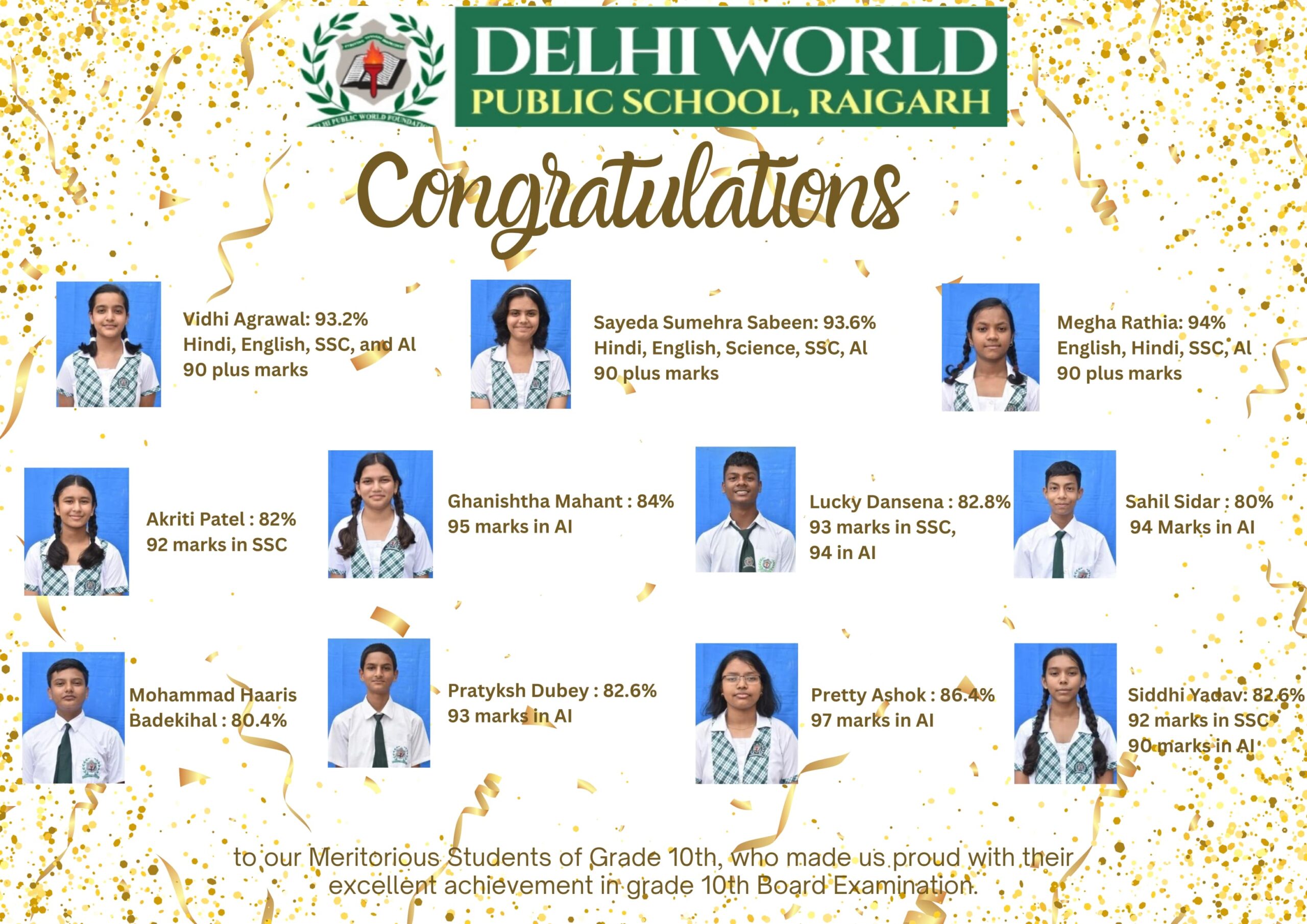दिल्ली वर्ल्ड पब्लिक स्कूल, रायगढ़ के छात्रों का शानदार प्रदर्शन, सीबीएसई कक्षा 10 में शत-प्रतिशत परिणाम रायगढ़.. डायरेक्टर श्रीमती अनिता अग्रवाल ने सभी छात्रों को दी उज्जवल भविष्य हेतु शुभकामनाएं…